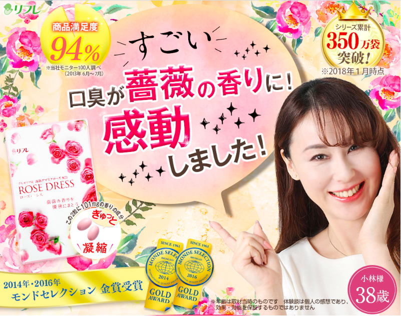 ローズドレスは、口臭対策、口臭予防のサプリメントです。匂いに気付いたとしてもなかなか相手に言いづらいのが口臭に関する問題なんですが、こちらのサプリはその匂いをバラの香りに変えてしまうというもの。従来品のバラのサプリ「薔薇の滴」より10倍以上の香り成分を配合しただけでなく、話題のエチケット成分「パンシル」も贅沢に配合し、自分では気づきにくいエチケット対策にも役立ちます。