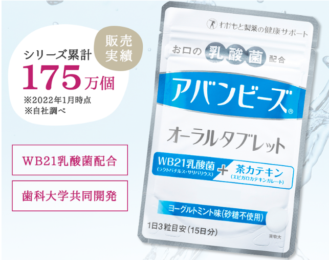 アバンビーズは、なめるだけで口の中が爽やかになると話題のオーラルサプリメントです。口臭対策として生きた乳酸菌と茶カテキンが配合されており、口の中の善玉菌といわれるWB21乳酸菌が、口腔内の環境を整えてくれます。また、虫歯予防効果が期待できるキシリトールも配合されており、虫歯がきになるという方にも安心して飲むことができます。タブレットタイプなので続けやすいという特徴もあります。